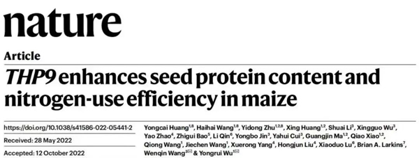 北京時間2022年11月17日,中國科學(xué)院分子植物科學(xué)卓越創(chuàng)新中心巫永睿研究團隊與上海師范大學(xué)王文琴研究團隊合作在Nature上發(fā)表了題為 “THP9 enhances seed protein content and nitrogen-use efficiency in maize”的研究論文。